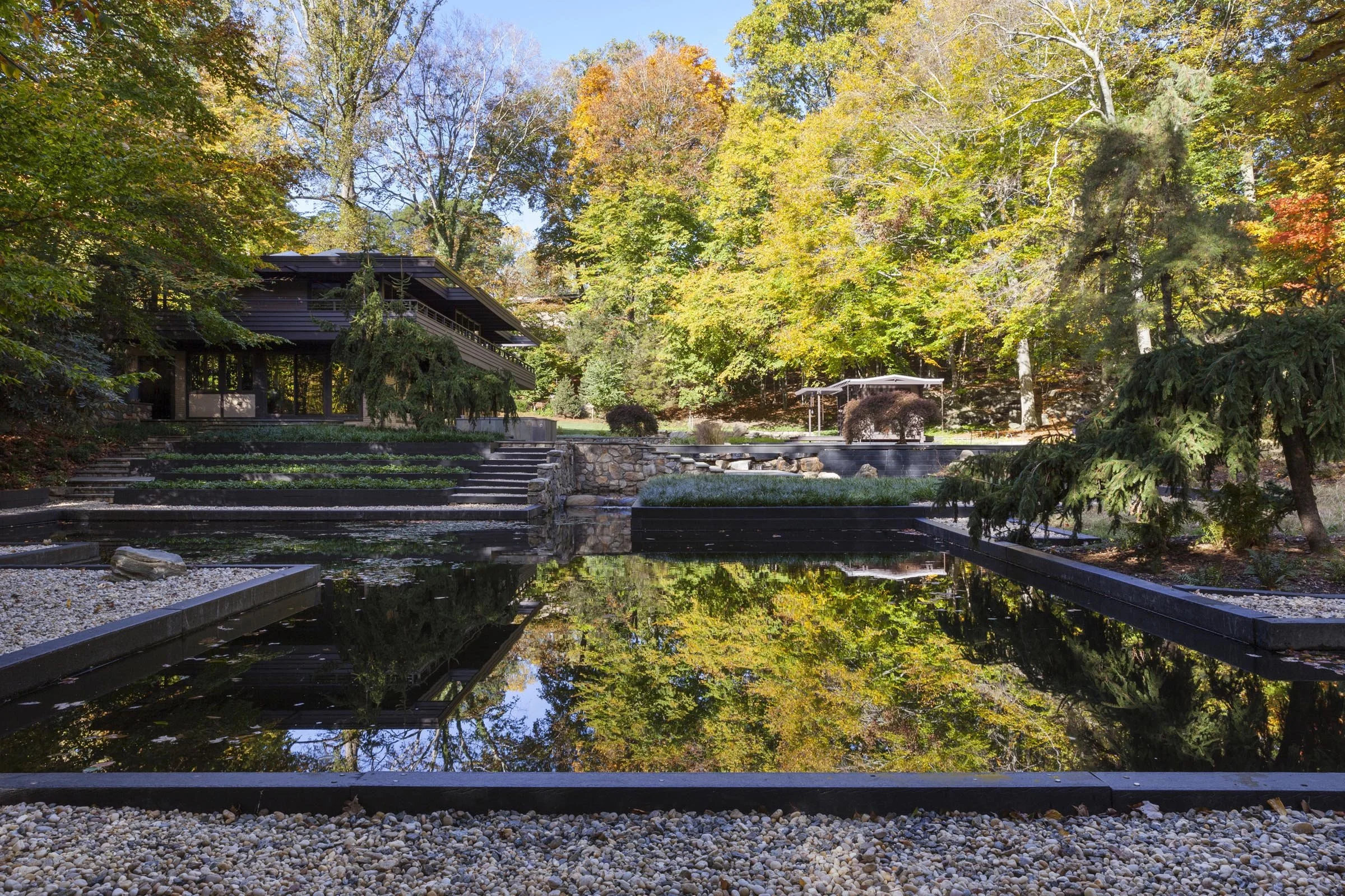 For the current owners, STA subtly enlarged and refurnished the house, adding a garage/studio and a tea house. The general outlines of the original ponds were deciphered from traces of railroad ties, surviving masonry weirs, impounded water and a relic bridge. The resulting landscape is a place that is both tranquil and vibrant, surrounded by ancient rock formations and native trees with the sounds of water cascading between the revived ponds.