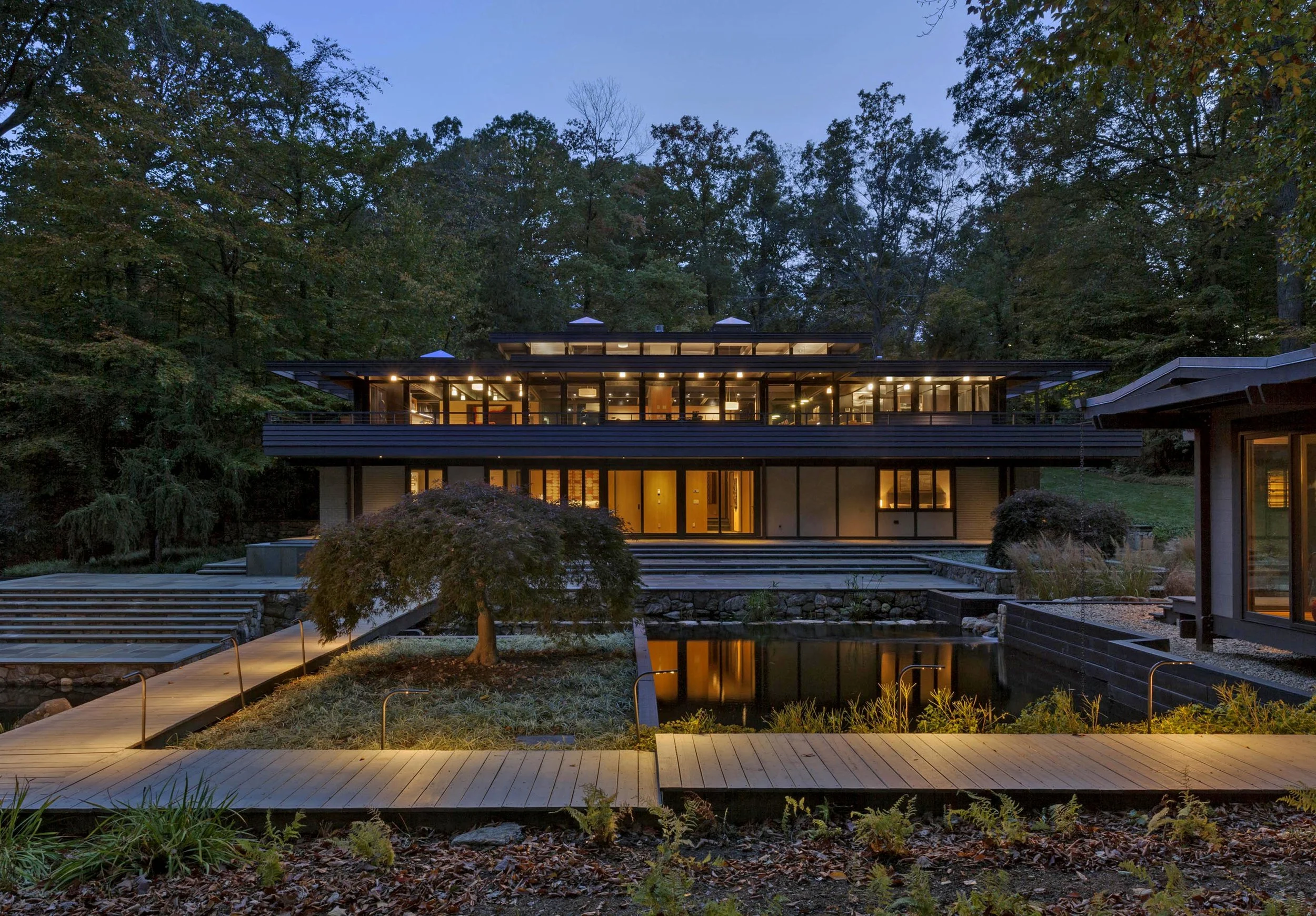 For the current owners, STA subtly enlarged and refurnished the house, adding a garage/studio and a tea house. The general outlines of the original ponds were deciphered from traces of railroad ties, surviving masonry weirs, impounded water and a relic bridge. The resulting landscape is a place that is both tranquil and vibrant, surrounded by ancient rock formations and native trees with the sounds of water cascading between the revived ponds.
