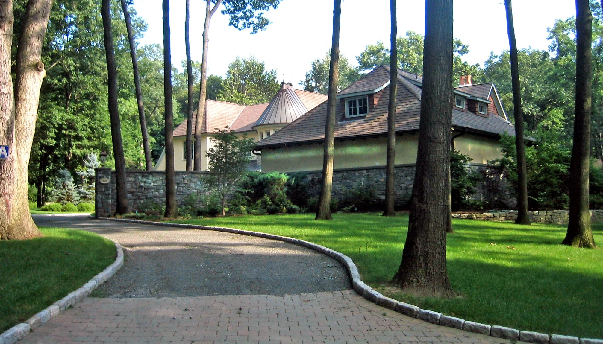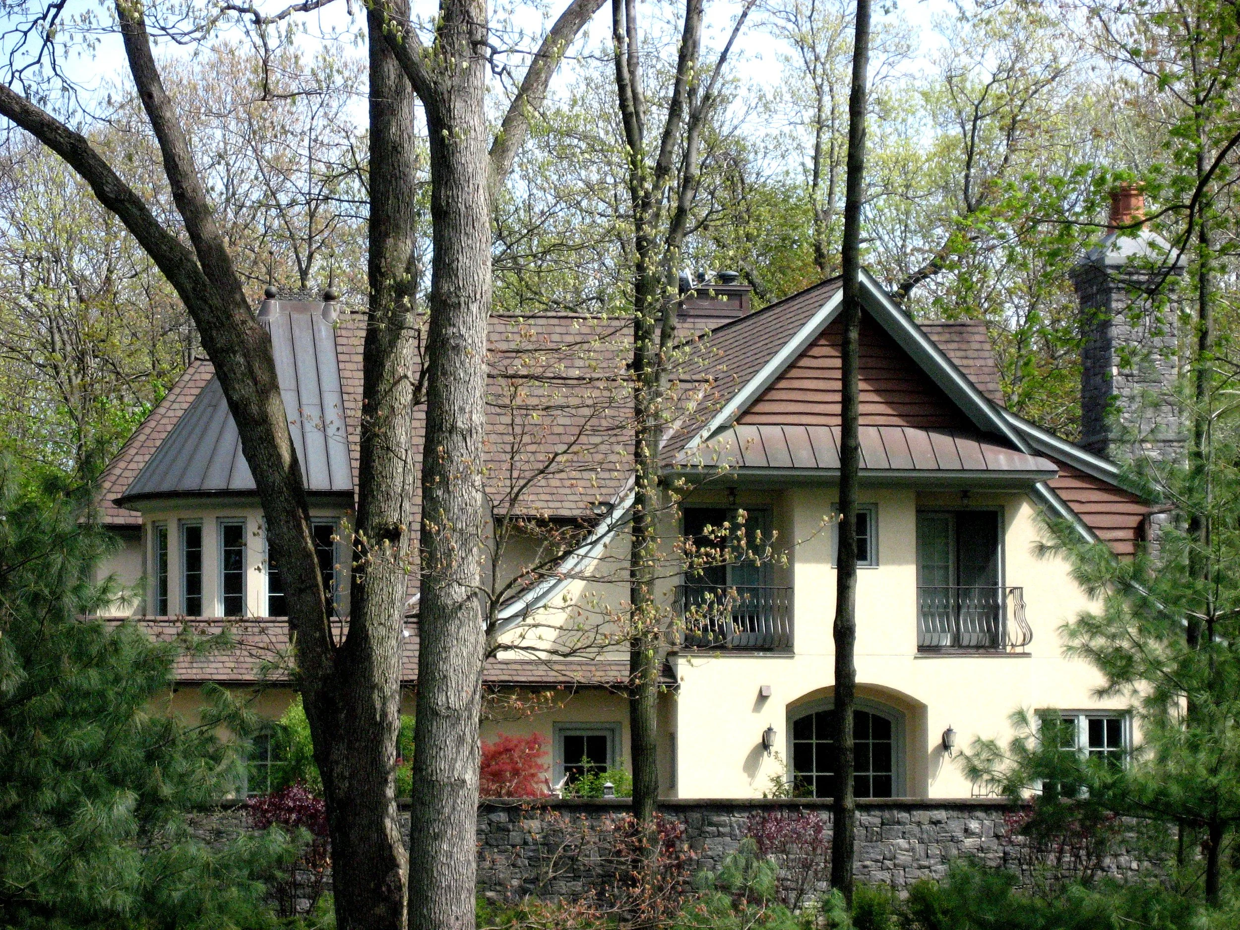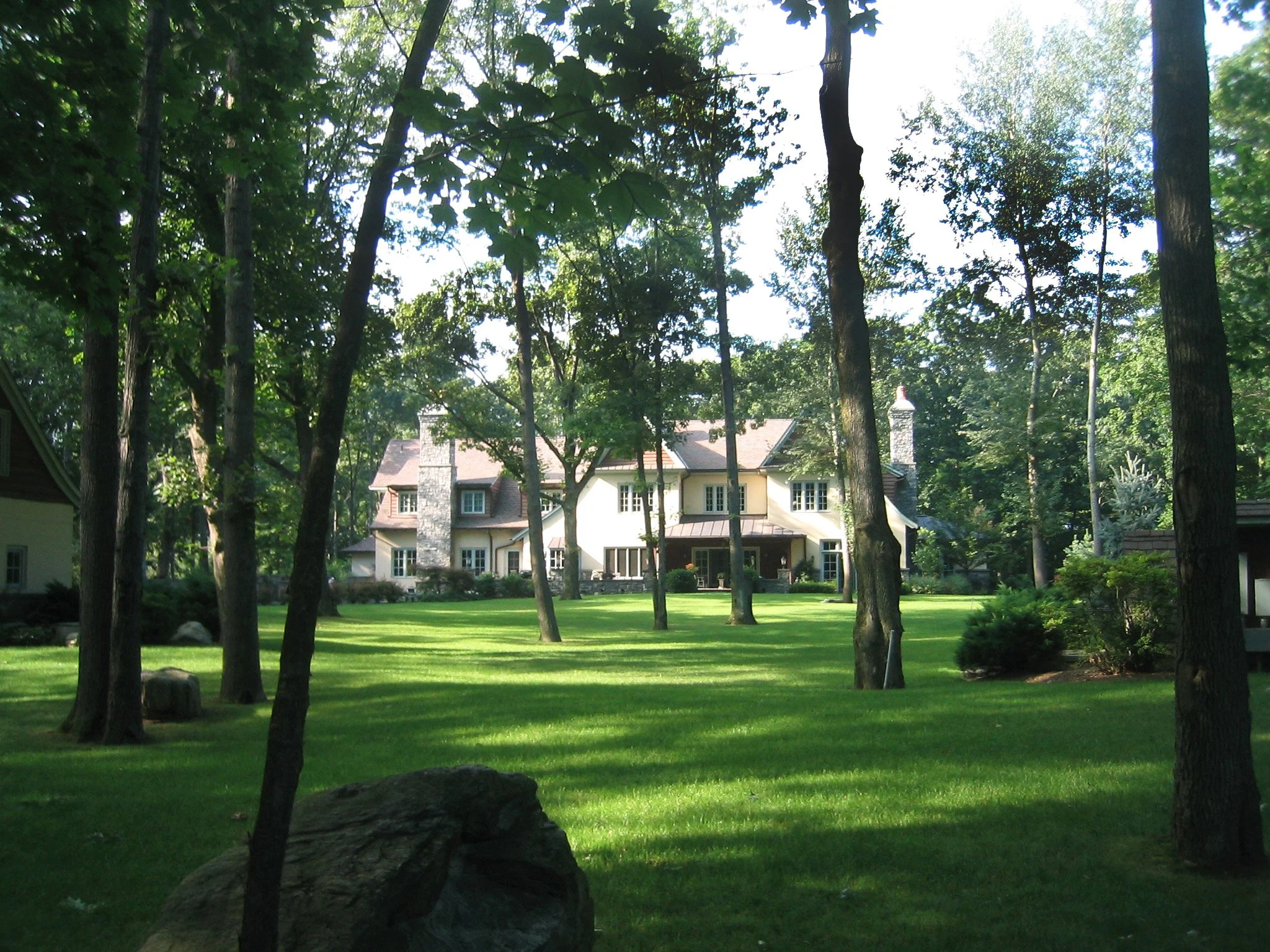 Walls enclosing the private northern entry courtyard of this Normandy Tudor Revival House, designed by STA for a hilltop site, extend to enclose the house and continue again into the landscape. All interior spaces have landscape views, and the most important living spaces on all levels have windows and French Doors that soak in the southern sun and open to terraces.