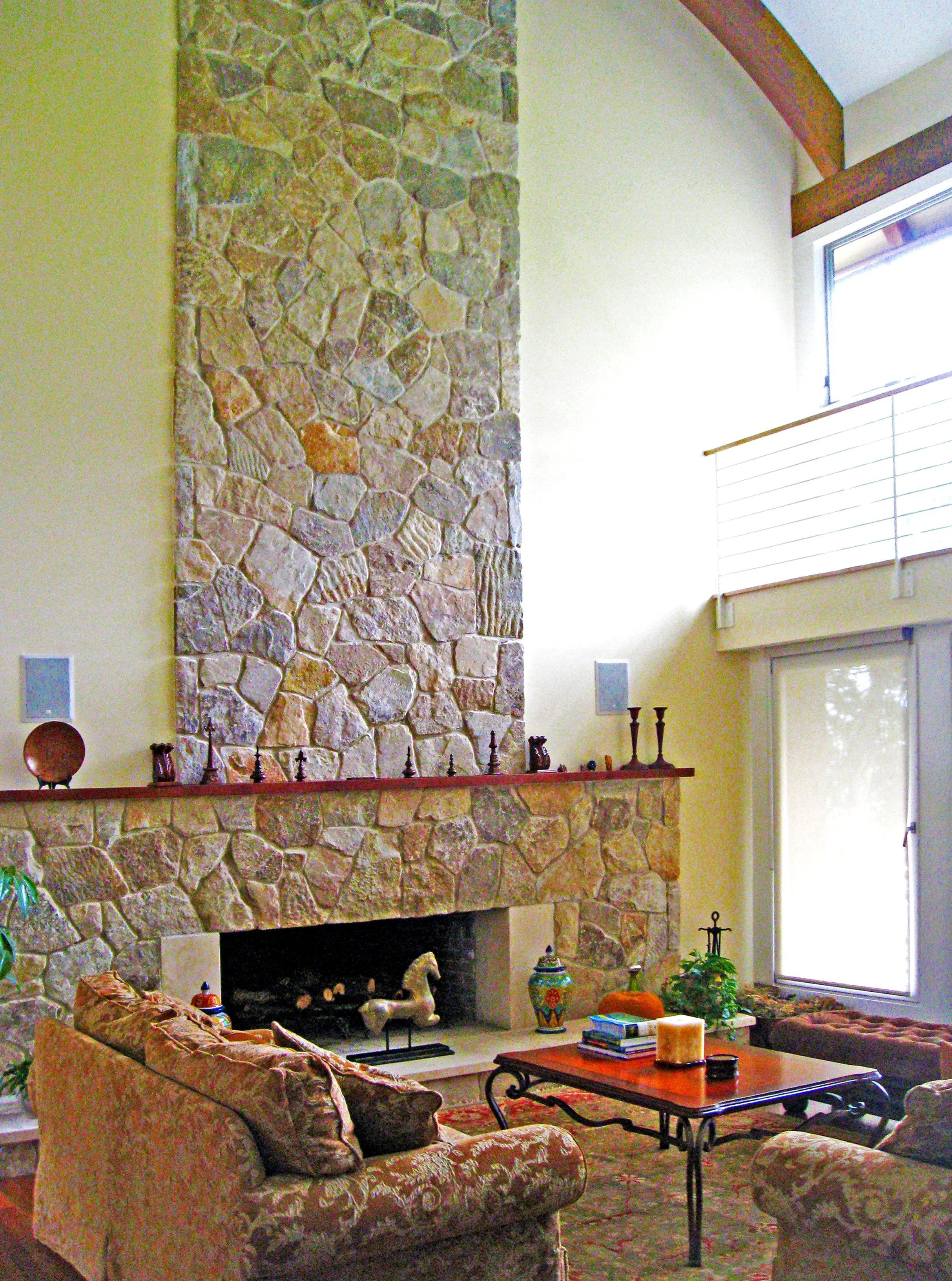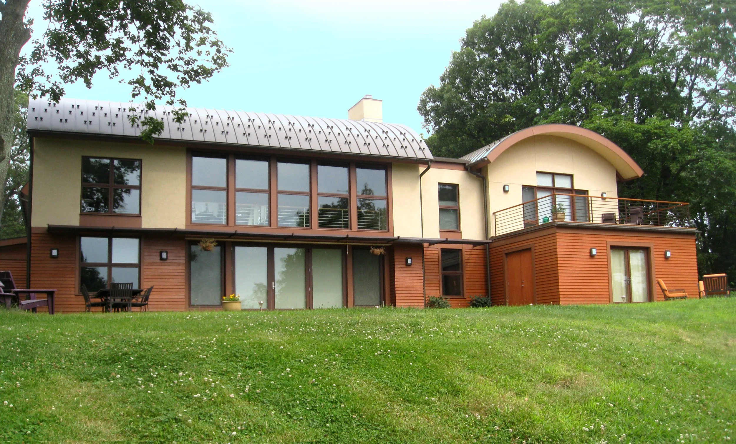 New barrel-vaulted roofs on additions and an accessory garage structure transformed a nondescript 1950s ranch house into a sleek modern residence with river views from balconies, rooftop deck and the new master bedroom suite. A giant stone masonry heater dominates the living room, where windows open to more river views.