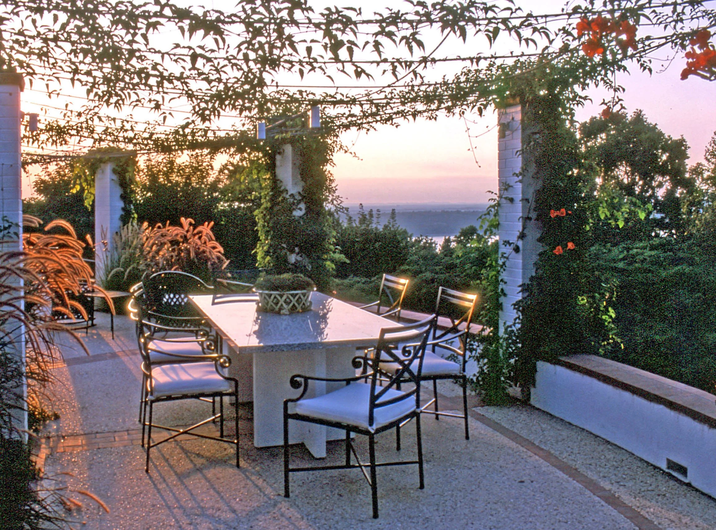 Clients with California roots came to work in New York and found a quirky 1950s brick house with a curved plan. They needed a pool, which we tucked into the curve, adding walls for privacy and sun capture, and they needed pleasant places to live and eat outdoors in good weather. Stainless steel cables slung between masonry columns carry trumpet vines and flowers for shade in daytime, and lighting fixtures illuminate evening feasts and parties. An addition with a glass wall provides year-round indoor enjoyment and views up the river and beyond it to other counties.