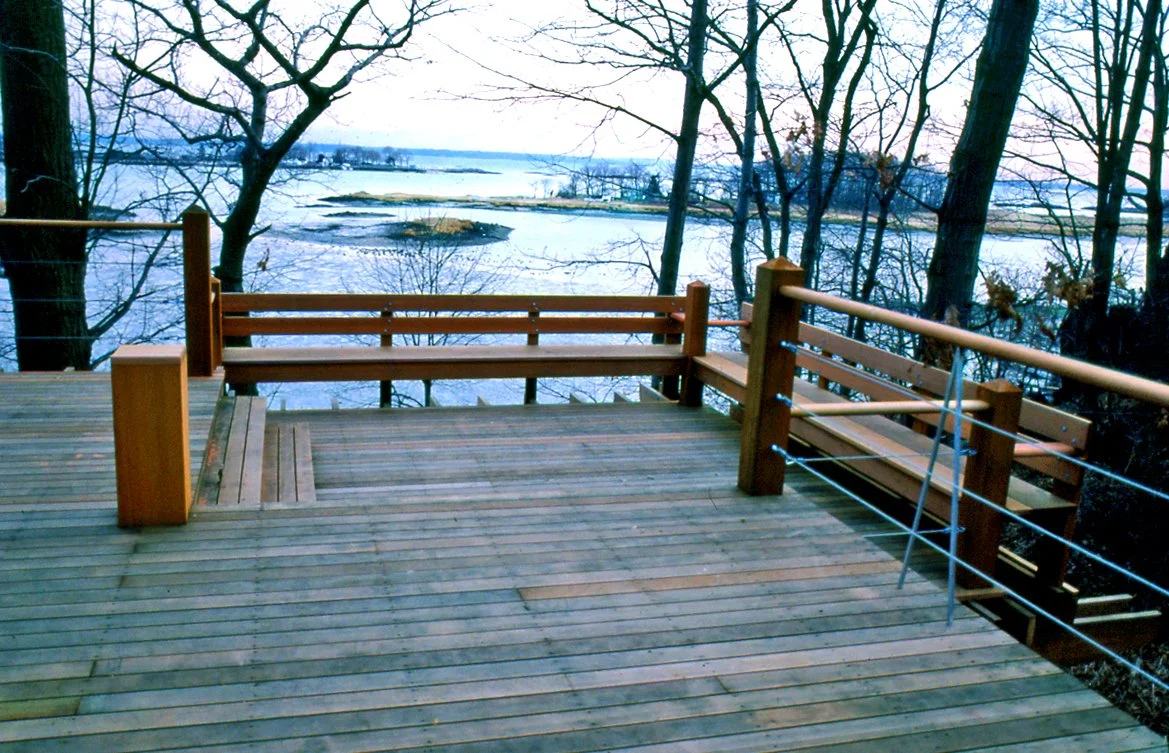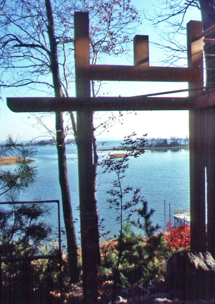 One can watch deer swimming in Long Island Sound and see marshland waterfowl from the deck on this Japanese inspired house. The deck, supported high in the air on giant clear heart redwood posts, has built-in bench seating and railings that maximize views. A Japanese tori formed by these posts frames views from lower levels.
