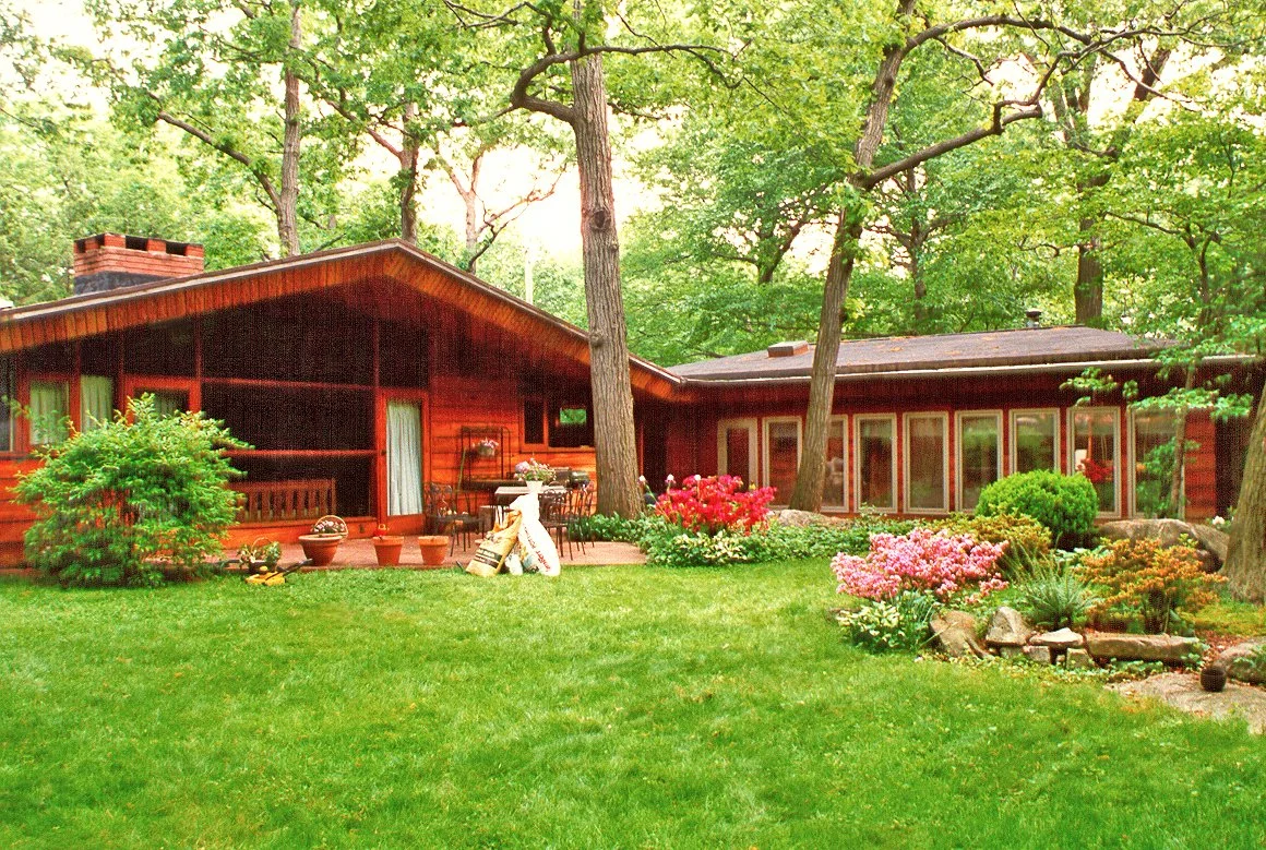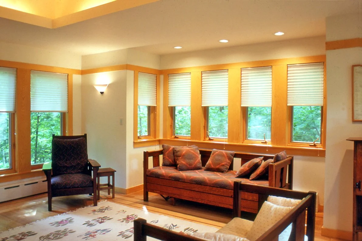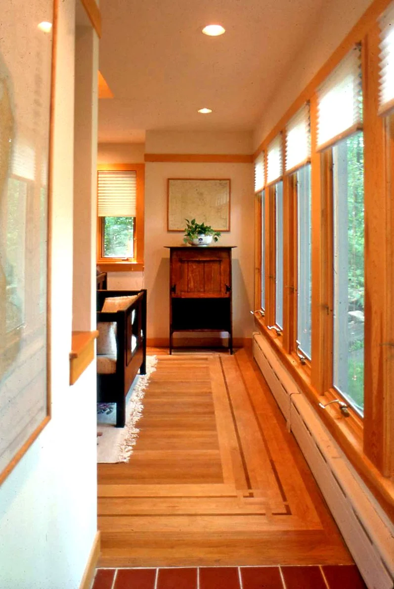 The owners of a house designed by an acolyte of Frank Lloyd Wright needed an addition to house their collection of Craftsman furniture. The addition employed Wright’s techniques including projected bays, wide overhangs of low-slope roofs and recessed lighting. Walnut and maple border patterns frame new vertical grain fir floors. The wing distinguishes itself carefully from the original composition and extends into the landscape with rows of individual operable windows.